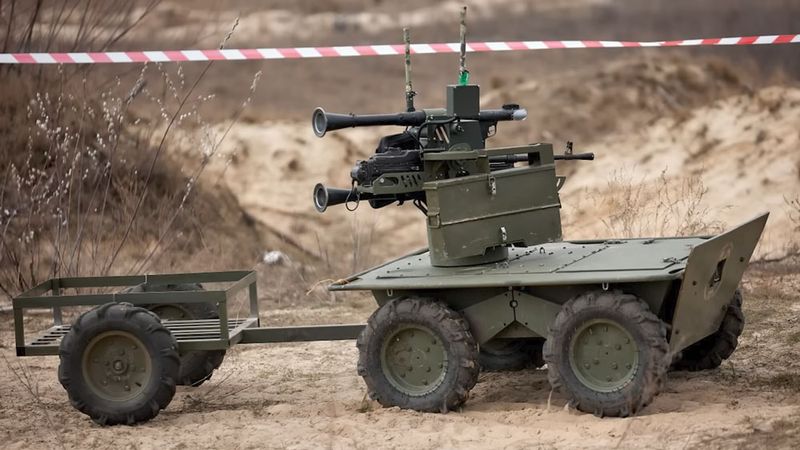 ウクライナ軍のロケットランチャーを搭載した地上ドローン(YouTubeのスクリーンショット)