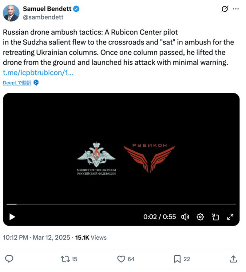 撤退するウクライナ軍を待ち伏せし、攻撃を行うロシア軍のドローン部隊「ルビコン」(Xのスクリーンショット)