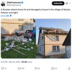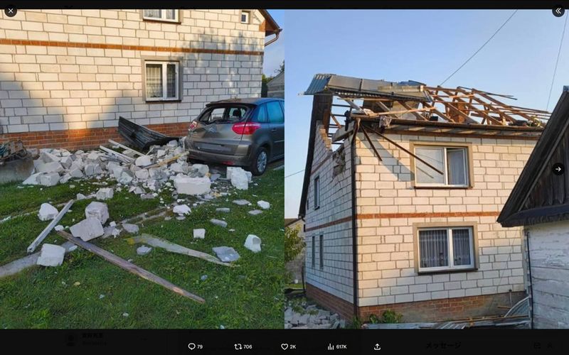 ロシアは9日から10日にかけての夜、ウクライナをシャヘド型ドローン400機あまりで攻撃し、一部のドローンがポーランドの領空を侵犯。そのうち1機がウクライナとの国境に近いポーランド・ビリキ村の民家を直撃した(Xのスクリーンショット)