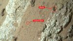 NASAの火星探査車パーシビアランスが2024年7月18日に撮影した岩石「チェヤバフォールズ」の画像。中央を縦に走る帯状の物質の表面には暗色の物質で縁取られた明色の小さな斑点群「レオパルドスポッツ(Leopard Spots)」がある。地球の堆積岩ではこの種の斑点が微生物のエネルギー源となる化学反応の結果として形成される。右側の白い硫酸カルシウム鉱脈には緑色のカンラン石(Olivine)の結晶が含まれている(NASA/JPL-Caltech/MSSS)