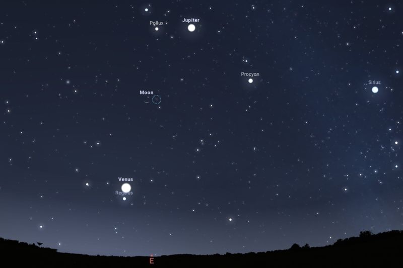 2025年9月18日、日の出1時間前(東京:午前4時26分ごろ)の東の空。細い月の隣には、かに座のプレセペ星団が見える(Stellarium)