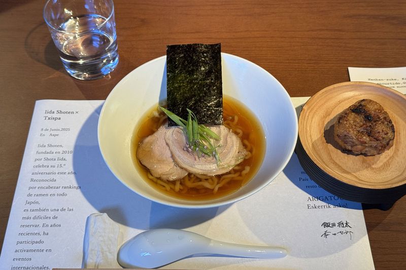 25年7月のスペイン「チスパ」とのコラボレーションでは、現地の豚や地鶏を使ったスープ、手打ち麺、スペイン豚のチャーシューで、その日限りのラーメンを。仕上げに店の畑で朝収穫したネギとネギの花を添えた。(Photos by Nao Suzuki)
