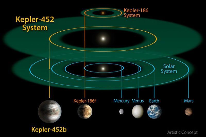 ケプラー186、ケプラー452、太陽系のシステムの比較。系外惑星「ケプラー452b」と地球が、同じくグリーンで示されたハビタブル・ゾーンにあることが分かる(c)NASA Ames/JPL-Caltech/R. Hurt