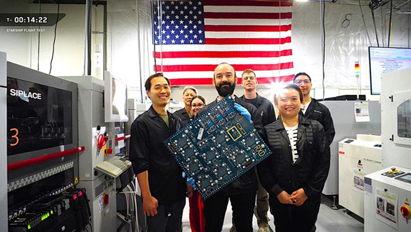 現行のスターリンク衛星(V2 Mini)のプリント基板。通信モジュールを含む複数の集積回路チップやオンボードコンピュータなどが搭載されている。「RXD」は受信データを意味する(c)SpaceX