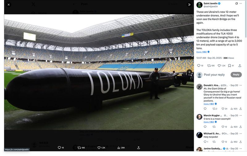 ウクライナ軍が発表した全長12mの巨大水中ドローン「トロカ-1000」(Xのスクリーンショット)
