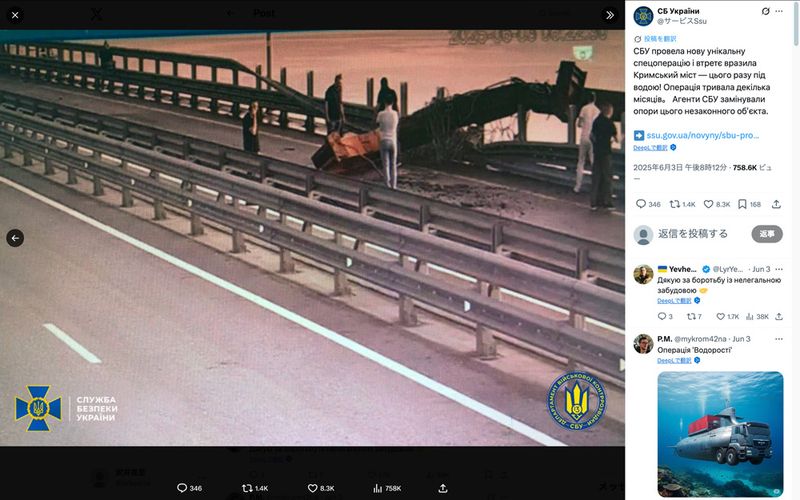 今年6月に、ウクライナの無人水上艇が、ロシアとクリミアを結ぶケルチ橋を攻撃したが、橋脚を崩すには至らなかった(Xのスクリーンショット)