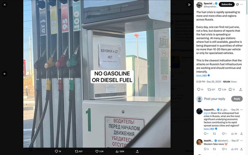ロシア国民は次第にガソリンの入手に苦労するようになっている(Xのスクリーンショット)