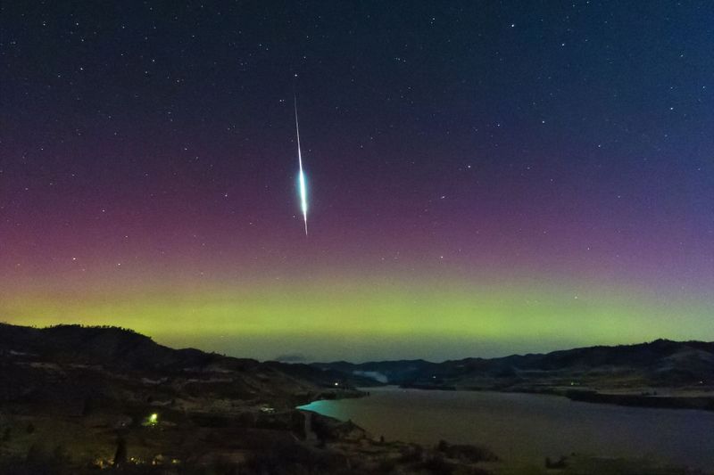 おうし座流星群の火球とオーロラ。米ワシントン州コルビル先住民居留地にて2015年11月3日撮影(Rocky Raybell, CC BY 2.0 <https://creativecommons.org/licenses/by/2.0>, via Wikimedia Commons)