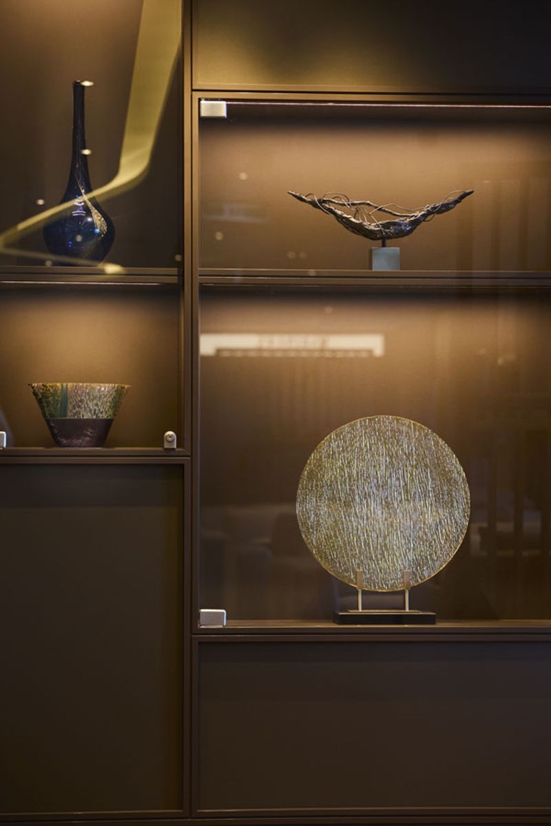 船内各所に飾られた“買える”工芸作品。作家たちは作品が旅をすることを喜んでいるという。