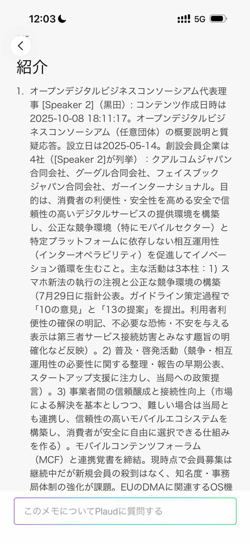 推論自動適応で要約させると全体を包括的にまとめ上げてくれる。これは3.0からの新機能で話者がどんな人と名乗って、何を話していたかも的確に分けてくれる