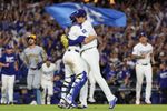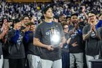 MLBナ・リーグ優勝決定シリーズで最優秀選手賞(MVP)を受賞し、チームメイトの祝福を受けるロサンゼルス・ドジャースの大谷翔平。2025年10月17日、米カリフォルニア州ロサンゼルスのドジャー・スタジアムで(Robert Gauthier/Los Angeles Times via Getty Images)