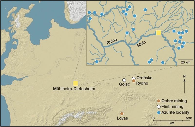 青色顔料の残留した石器が出土したドイツのミュールハイム・ディーテスハイム周辺の地図。右上の青い丸はライン川・マイン川流域のアズライト産出地を示している(Wisher et al., 2025. Published by Cambridge University Press on behalf of Antiquity Publications Ltd)