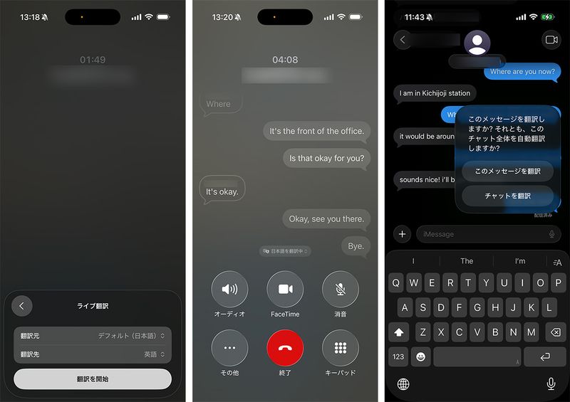 iOSの「電話」アプリと「メッセージ」アプリのライブ翻訳。電話アプリは通話を開始後、「その他」メニューからライブ翻訳を選択してオンにする