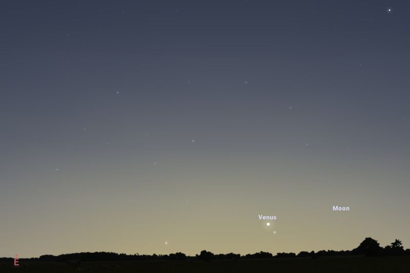 2025年11月19日(東京:午前5時45分頃)の東南東の空。右上に見える明るい星はスピカ(Stellarium)