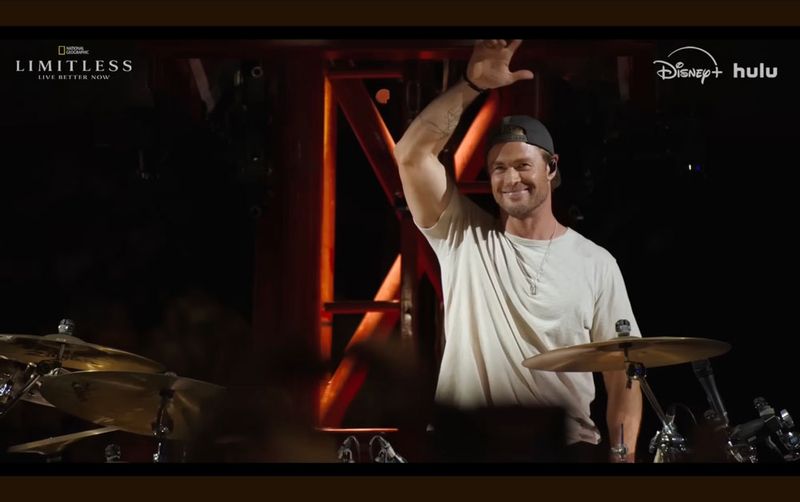 Disney+のドキュメンタリーシリーズ『リミットレス with クリス・ヘムズワース』の最新エピソードで、ヘムズワースはドラム演奏に挑戦する(YouTubeのスクリーンショット)
