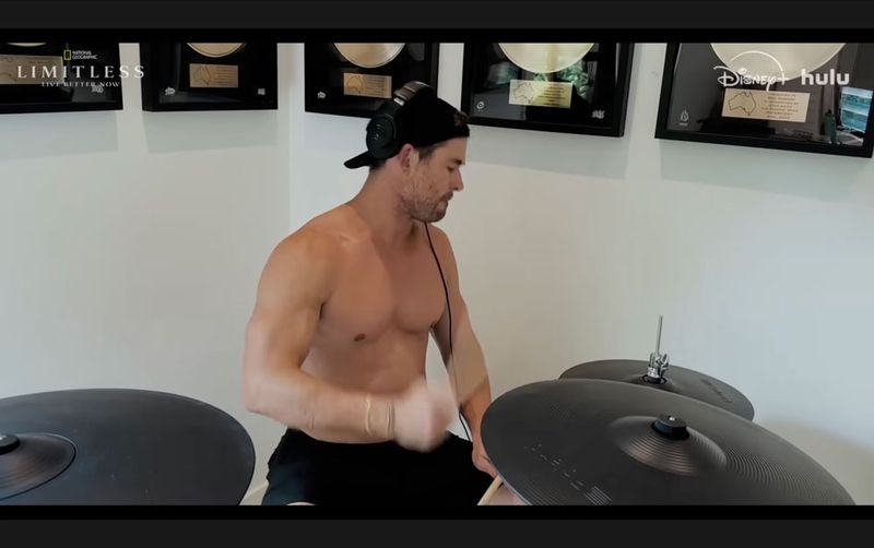 Disney+のドキュメンタリーシリーズ『リミットレス with クリス・ヘムズワース』の最新エピソードで、ヘムズワースはドラム演奏に挑戦する(YouTubeのスクリーンショット)