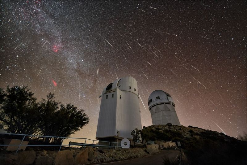 米アリゾナ州トゥーソン郊外にあるキットピーク国立天文台(KPNO)の上空に降り注ぐ、ふたご座流星群の流れ星(KPNO/NOIRLab/NSF/AURA/R. Sparks)