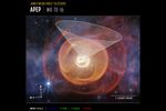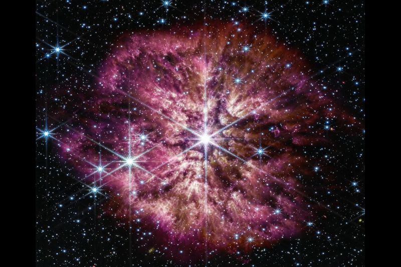ジェームズ・ウェッブ宇宙望遠鏡(JWST)の近赤外線カメラ(NIRCam)と中赤外線装置(MIRI)の観測による合成画像の中央に明るく輝く高温のウォルフ・ライエ星「WR 124」(NASA, ESA, CSA, STScI, Webb ERO Production Team)
