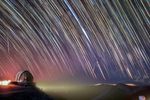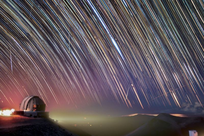 ハワイ・マウナケア山頂にあるジェミニ北天文台の上空に降り注ぐふたご座流星群。2020年12月13日撮影(International Gemini Observatory/NOIRLab/NSF/AURA)