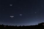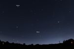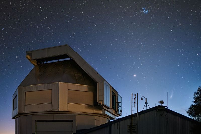 米アリゾナ州にあるキットピーク国立天文台(KPNO)の3.5mWIYN望遠鏡の上空に輝く、木星(中央右)とプレアデス星団(右上)、ポンス・ブルックス彗星(右下)。2024年8月7日公開(KPNO/NOIRLab/NSF/AURA/R. Sparks)
