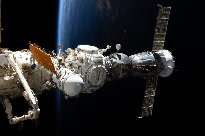 ノード・モジュール「プリチャル」に接続する有人宇宙船ソユーズMS-27。2025年8月撮影。(c)NASA