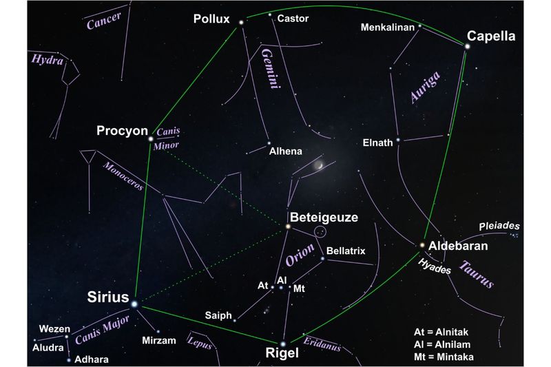 冬を代表する1等星たちがつくる「冬のダイヤモンド(冬の大六角)」と「冬の大三角」(Elop using Stellarium, CC BY-SA 3.0 <https://creativecommons.org/licenses/by-sa/3.0>, via Wikimedia Commons)