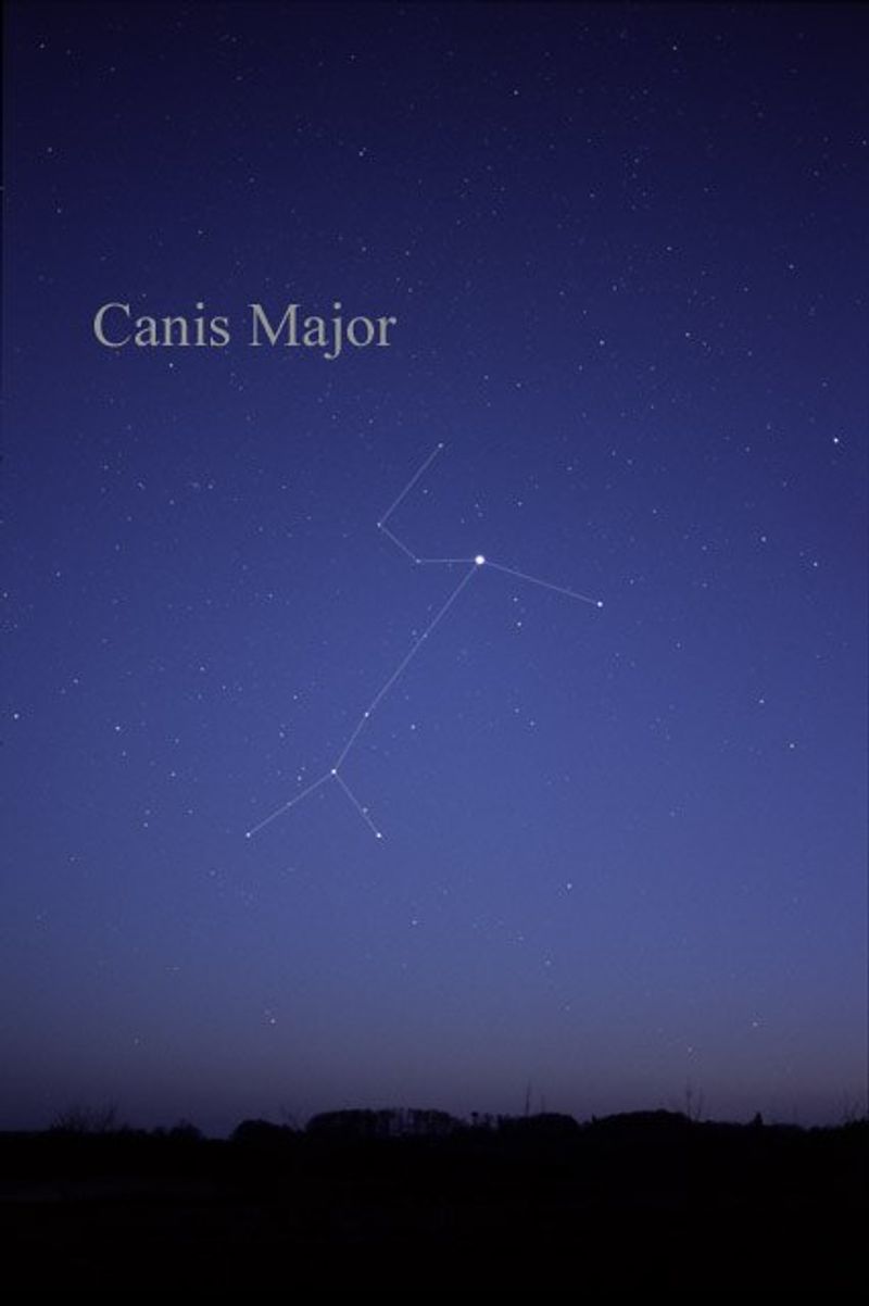 夜空に見える「おおいぬ座(Canis Major)」。最も明るい星がシリウスで、イプシロン星アダラは犬の後ろ足の付け根、ベータ星ミルザムは前足の先端に位置する(CC image by Till Credner via Wikimedia Commons)