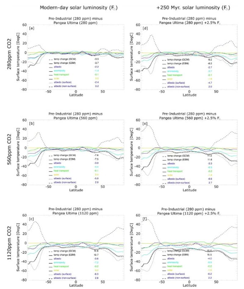 現在、太陽光の強さが2.5%増した場合、さらに地形が倍化した場合における、CO₂濃度別の最も暑い月の体感温度(HUMIDEX)。出典:Nature Geoscience