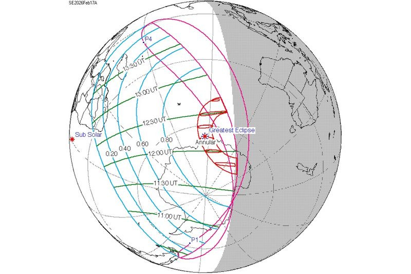 2026年2月17日の金環日食・部分日食を見られる地域を示した地図。NASAゴダード宇宙飛行センター(GSFC)の天体物理学者フレッド・エスペナックの予測に基づく(Eclipse Predictions by Fred Espenak, NASA's GSFC, Public domain, via Wikimedia Commons)