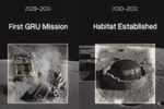 左はNASAのCLPSのランダーによってGRUブロックの実証を行うミッション1。右はミッション2による「月面カーブベース」 (c)GRU Space