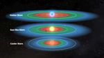 惑星系の中心星のタイプによるハビタブルゾーン(生命生存可能領域、図中の緑色の領域)の違いを比較したイラスト。太陽に似た恒星(G型矮星、中央)に比べてより小型、低温で質量が小さい恒星(M型矮星、下)のハビタブルゾーンはより中心星に近くなり、より大型、高温で質量が大きい恒星(A型矮星、上)のハビタブルゾーンはより中心星から遠くなる(NASA/Kepler Mission/Dana Berry)