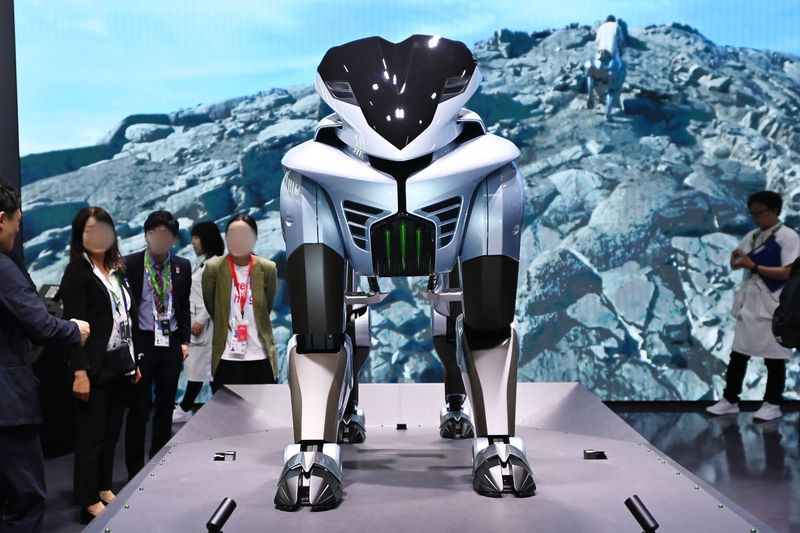 大阪万博で披露された、川崎重工業の4脚型オフロードパーソナルモビリティ「CORLEO」。4本脚で走行し、人がまたがって乗れるという(Photo by David Mareuil/Anadolu via Getty Images)