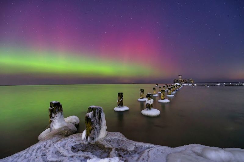 ポーランド・グディニア北部バビエ・ドウィの海岸から見た、バルト海上空に広がるオーロラ。2026年1月20日撮影(Shutterstock.com)