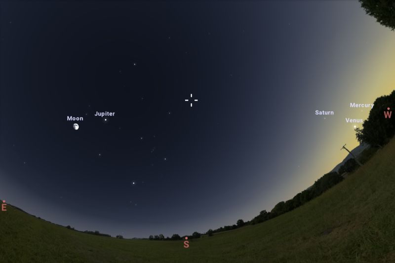 2026年2月28日、日の入り35分後(東京:午後6時10分)頃の南東~西の空、水星、金星、木星、土星と天王星の位置関係(Stellarium)