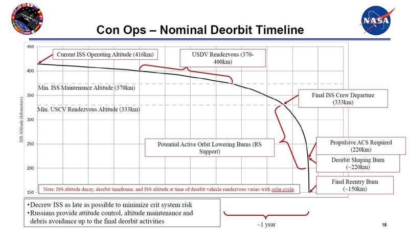 ISSを大気圏に再突入させるプランのタイムライン。USDVは落下の1~2年前にISSに接続される