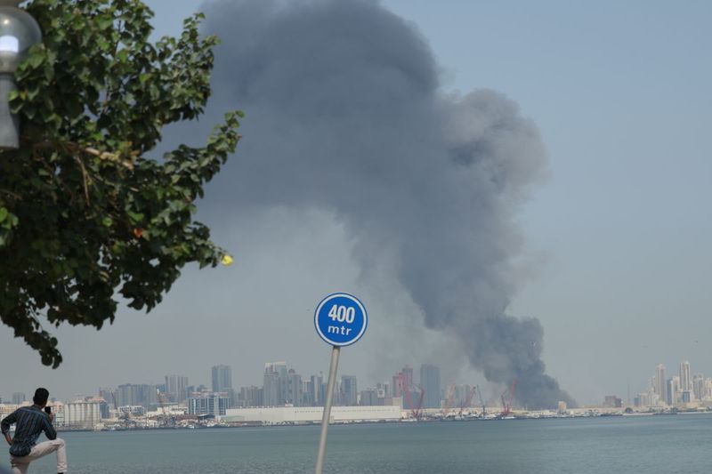 中東バーレーンの首都マナマで2026年2月28日、米国とイスラエルが行った攻撃に対するイランの報復ミサイル攻撃を受け、黒煙を上げる米海軍第5艦隊司令部の施設(Stringer/Anadolu via Getty Images)