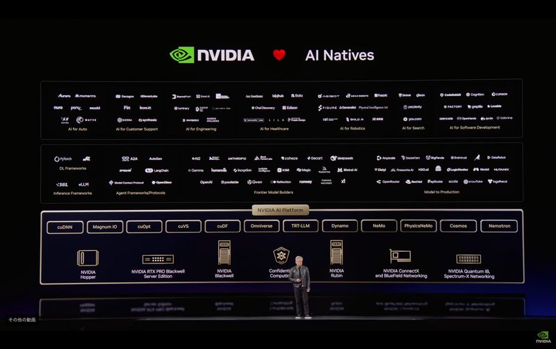NVIDIA GTC San Jose 2026基調講演で発表された103社のAIネイティブな企業・組織・サービス(YouTubeのスクリーンショット)
