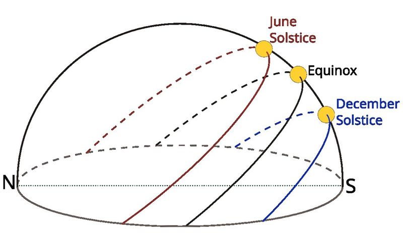 「分点」と「至点」の日における太陽の動き(Maxmath12, CC0, via Wikimedia Commons)