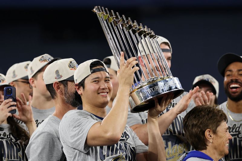 2025年11月2日、オンタリオ州トロントのロジャース・センターで行われた2025年ワールドシリーズ第7戦で勝利し、優勝トロフィーを掲げる大谷翔平(Photo by Emilee Chinn/Getty Images)