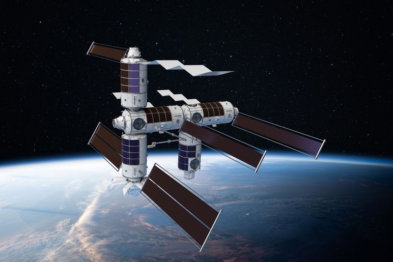 アクシオム・ステーションの完成予想図。最初のモジュールは打ち上げ後にISSの船首に接続。その後分離され、後続モジュールが接続される (c)Axiom Space
