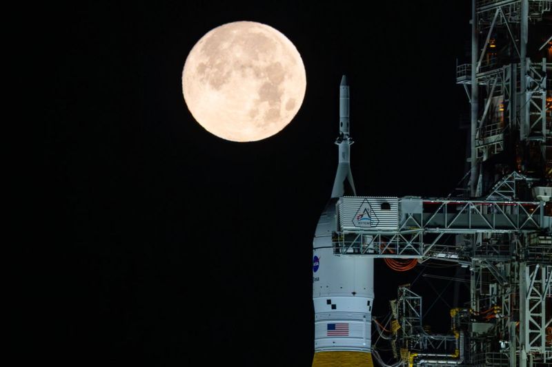 NASA主導の有人月探査計画「アルテミスII」の打ち上げロケット「スペース・ローンチ・システム(SLS)」と宇宙船「オリオン」のそばに輝く満月。米フロリダ州のケネディ宇宙センターにて、2026年2月1日撮影(NASA/Sam Lott)