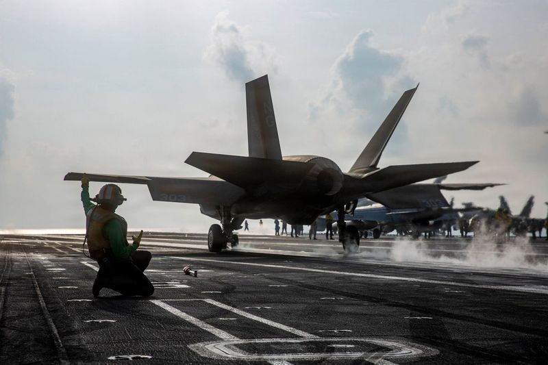 米軍の「エピック・フューリー作戦」で、ニミッツ級空母「USSエイブラハム・リンカーン(CVN-72)の飛行甲板から離陸するステルス艦上戦闘機F35C「ライトニングII」。2026年3月21日撮影、米海軍提供写真(NAVCENT Public Affairs, Public domain, via Wikimedia Commons)