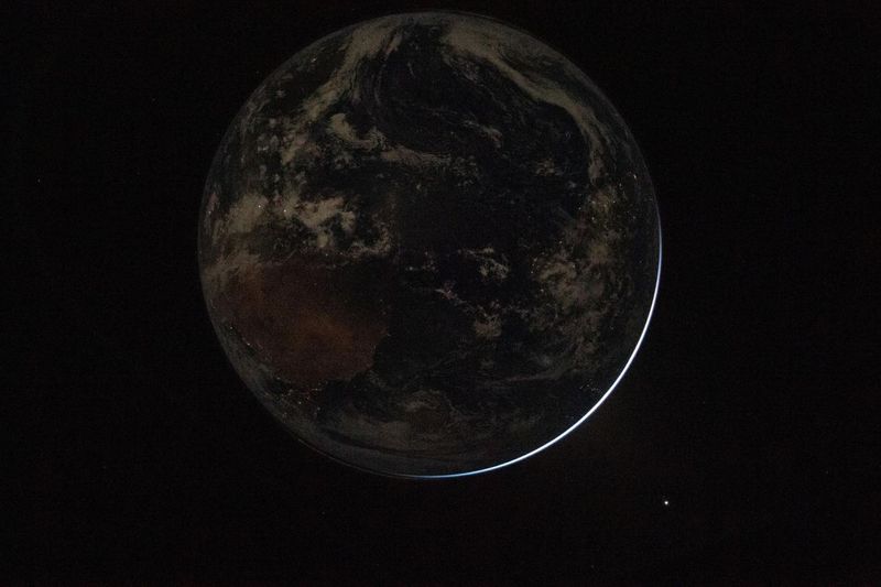 NASAの宇宙飛行士で「アルテミスII」のミッション・コマンダー(船長)を務めるリード・ワイズマンが宇宙船「オリオン」から撮影した、逆光の地球(夜側)の眺め。2026年4月3日撮影(NASA/Reid Wiseman)