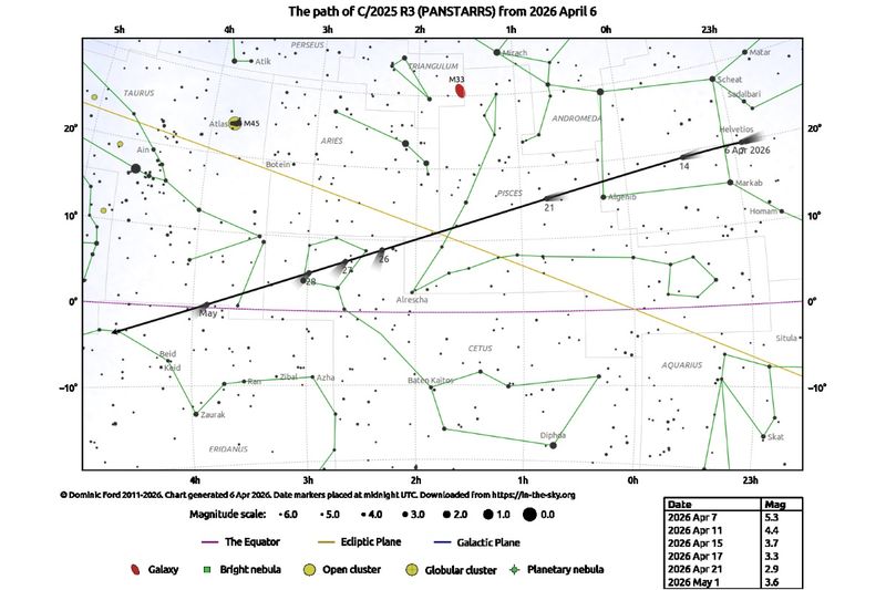 パンスターズ彗星「C/2025 R3(PanSTARRS)」のファインダーチャート(© Dominic Ford, In-The-Sky.org)