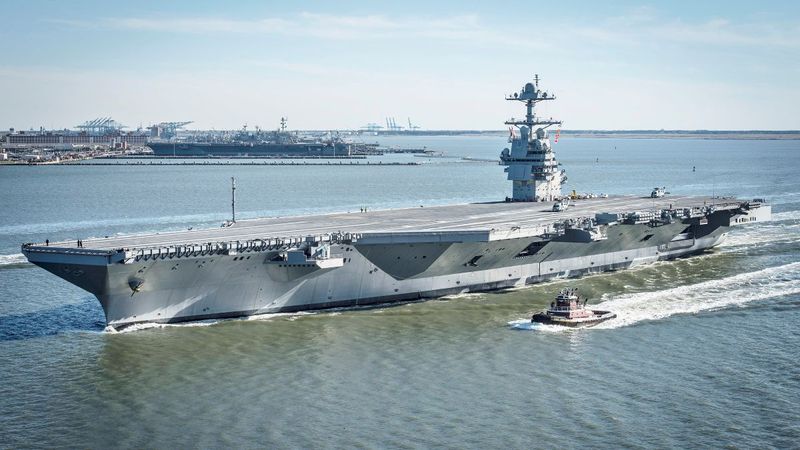 米バージニア州のニューポートニューズ造船所を出港し、海上公試運転に向けて初めて自力航行する米海軍の原子力空母「USSジェラルド・R・フォード(CVN-78)」。2017年4月8日撮影(U.S. Navy photo by Mass Communication Specialist 2nd Class Ridge Leoni, Public domain, via Wikimedia Commons)