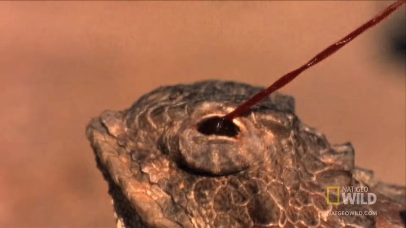 イヌ科の捕食者に対して眼から「血を噴射」するツノトカゲ(YouTubeのスクリーンショット)