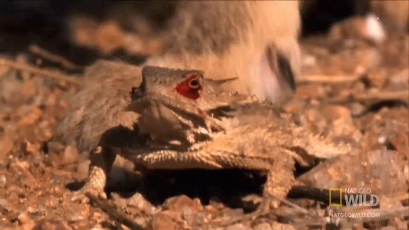 イヌ科の捕食者に対して眼から「血を噴射」するツノトカゲ(YouTubeのスクリーンショット)