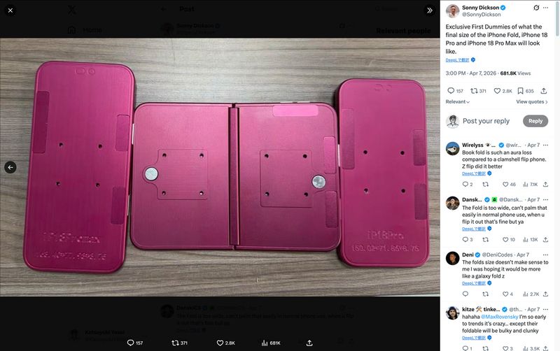 アップル初の折りたたみ式iPhone(おそらく「iPhone Fold」もしくは「iPhone Ultra」)のダミー(Xのスクリーンショット)