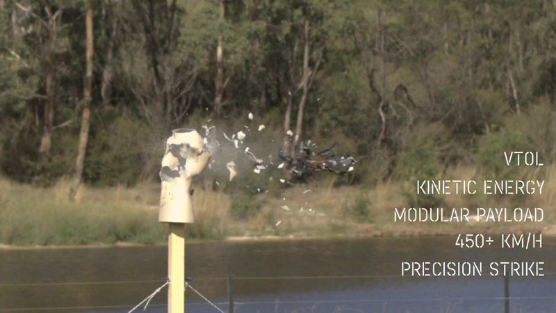 先端に刃を取り付けた「フライングソード(空飛ぶ剣)」と呼ばれる攻撃ドローン(無人機)が人形標的を貫く様子。開発元の英シャドーブレイク・インターナショナル社の幹部がXに投稿した動画から