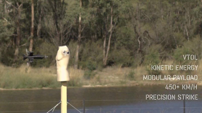 先端に刃を取り付けた「フライングソード(空飛ぶ剣)」と呼ばれる攻撃ドローン(無人機)が人形標的を貫く様子。開発元の英シャドーブレイク・インターナショナル社の幹部がXに投稿した動画から